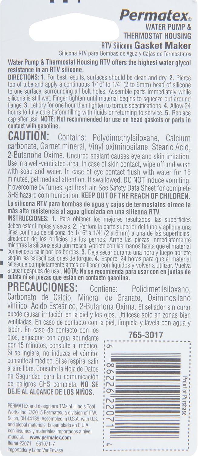 Permatex Water Pump and Thermostat RTV Silicone Gasket is a non-corrosive, sensor-safe RTV silicone gasket material formulated specifically for water pumps and thermostat housings. This gasket maker has the highest water-glycol resistance available in an RTV silicone. With a temperature range of -65 degrees fahrenheit to 500 degrees fahrenheit intermittent, these gasket makers offer significant performance advantages, excellent torque retention and hi-temp, sensor-safe properties. Extended warranties, engine sensors and new component materials such as aluminum, bi-metal alloys and high-tech plastics, have created the need for superior RTV silicone gasket makers in both OEM production and service applications. Permatex always has the right gasket maker for your application.