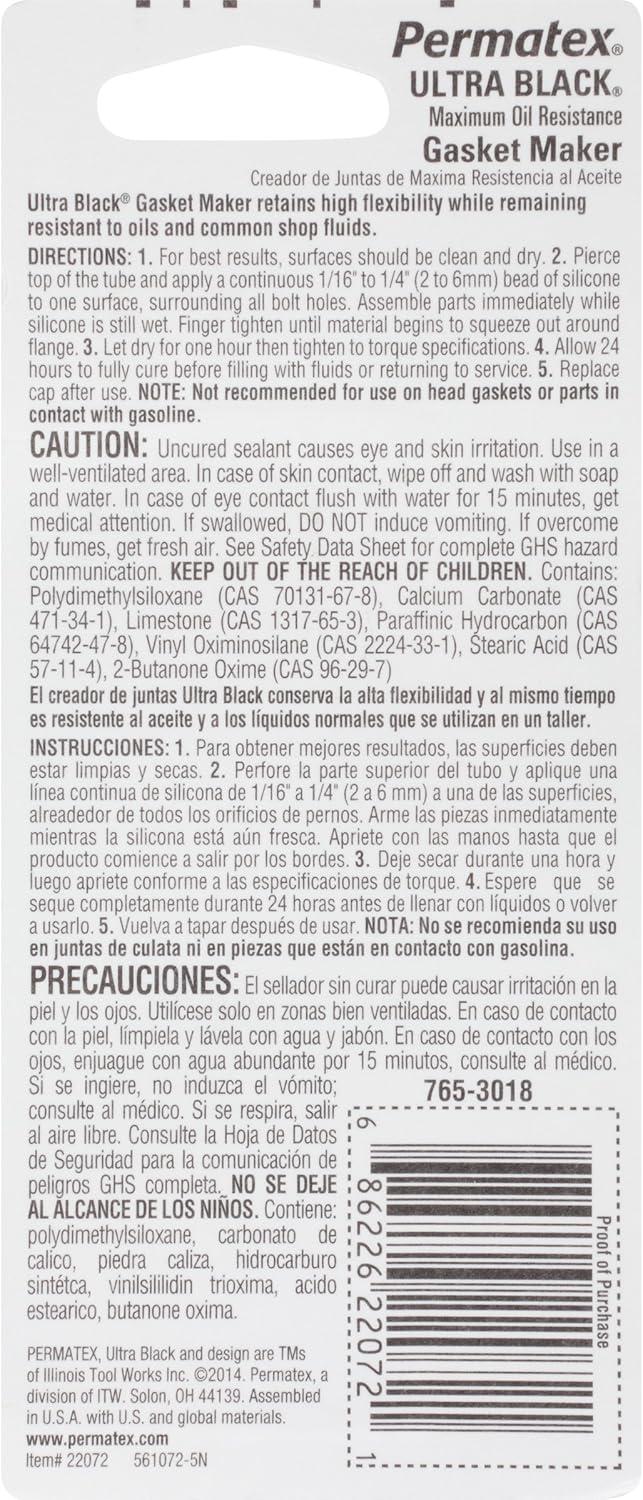 Permatex Ultra Black Maximum Oil Resistance RTV Silicone Gasket Maker is a fast-curing, sensor safe, low odor, non-corrosive formula that retains high flexibility, and oil resistance properties through use of a patented adhesion system. This gasket maker meets performance specs of OE silicone gaskets and is OEM specified. For dealership warranty requirements it also ensures extended drivetrain warranty compliance. Temperature range -65 degrees fahrenheit to 500 degrees fahrenheit intermittent; resists auto and shop fluids and vibration. These gasket makers offer significant performance advantages, excellent torque retention and hi-temp, sensor-safe properties. Extended warranties, engine sensors and new component materials such as aluminum, bi-metal alloys and high-tech plastics, have created the need for superior RTV silicone gasket makers in both OEM production and service applications. Permatex always has the right gasket maker for your application.