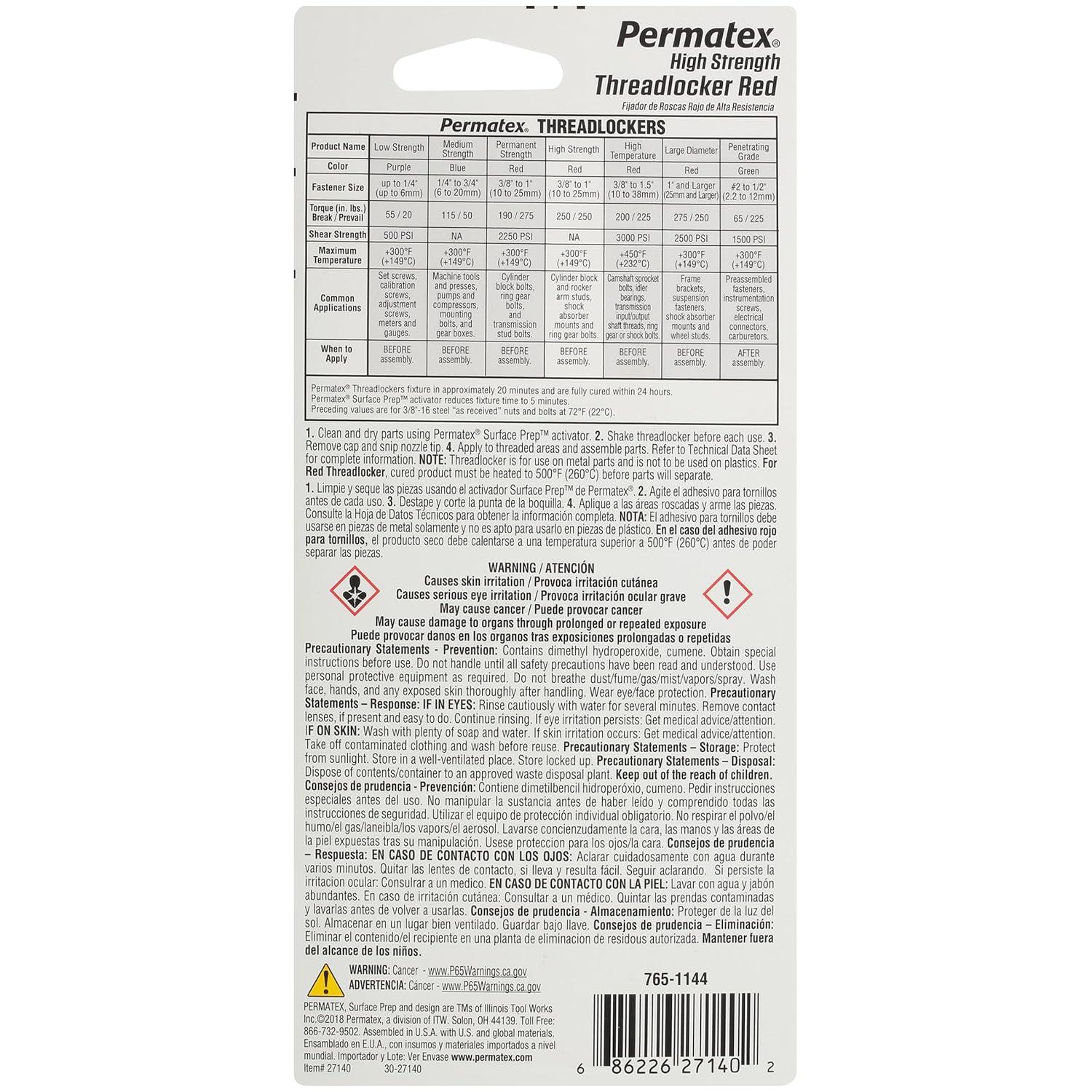Permatex 27140 High Strength Threadlocker Red, 36 ml(10 ml)