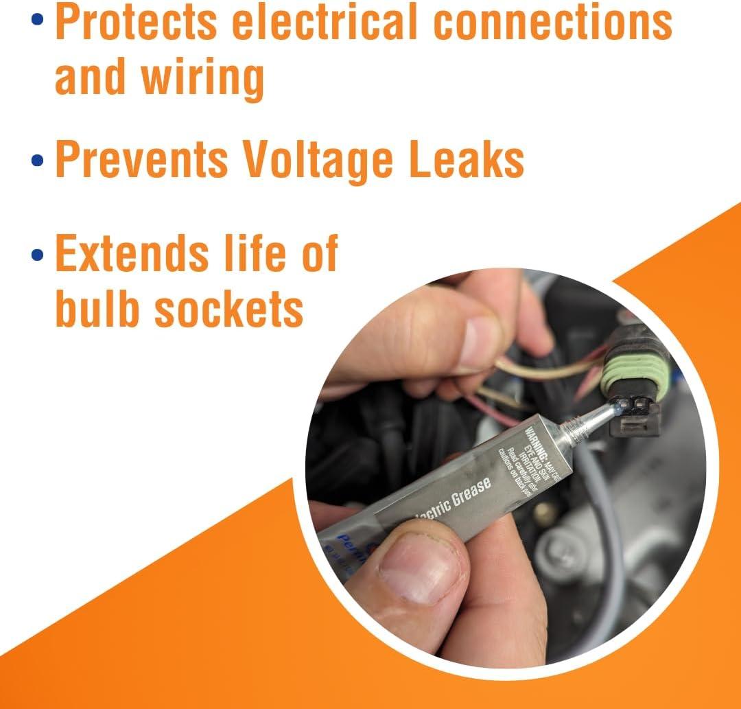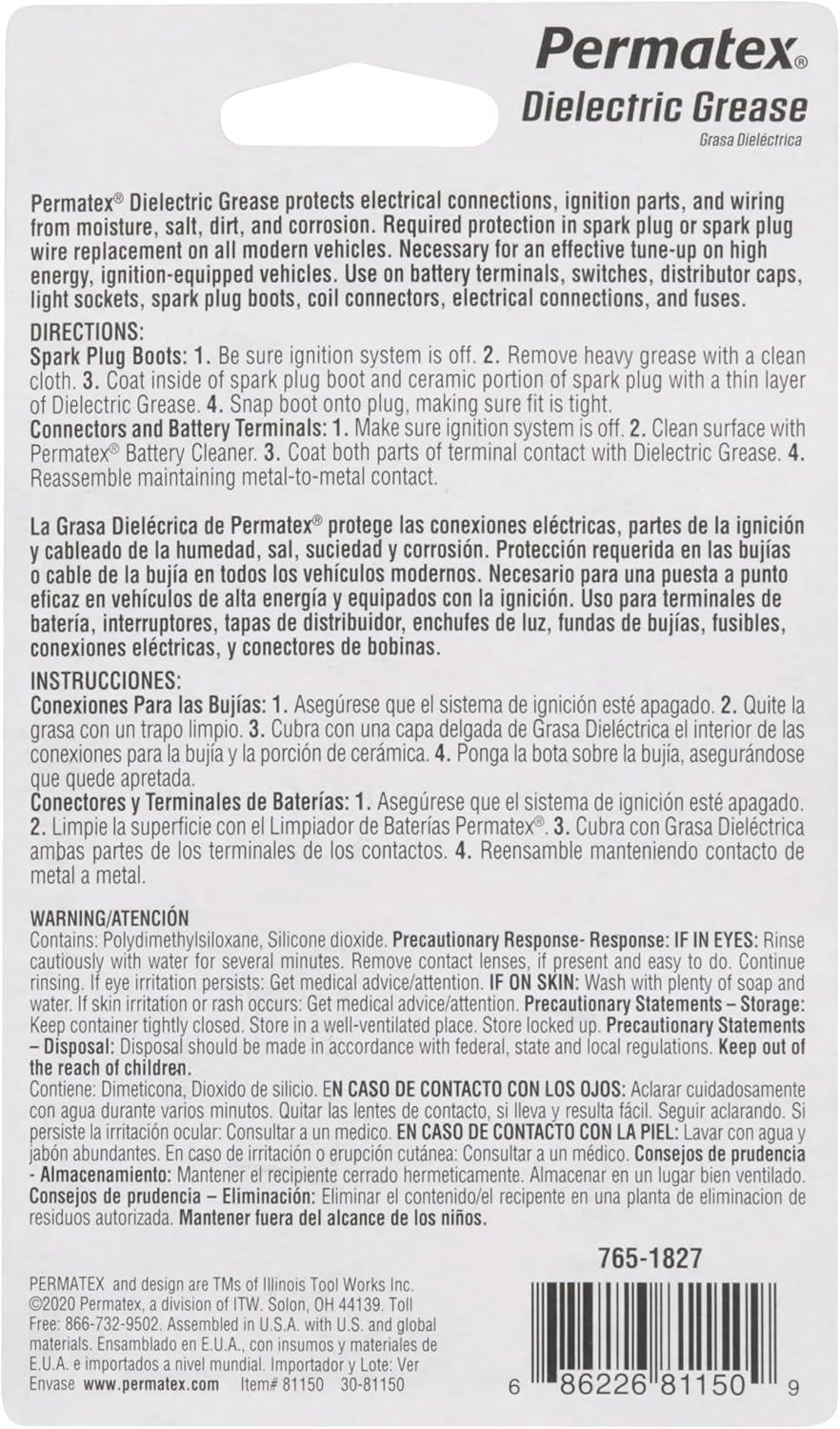 Permatex Dielectric Tune-Up Grease protects electrical connections and wiring from salt, dirt and corrosion. Required for modern high energy ignition systems, dialectric grease extends the life of bulb sockets and prevents voltage leaks around any electrical connection. Also prevents spark plugs from fusing to boots. Suggested applications: marine and automotive electrical connections, spark plug boots, trailer hitches, and battery terminals.