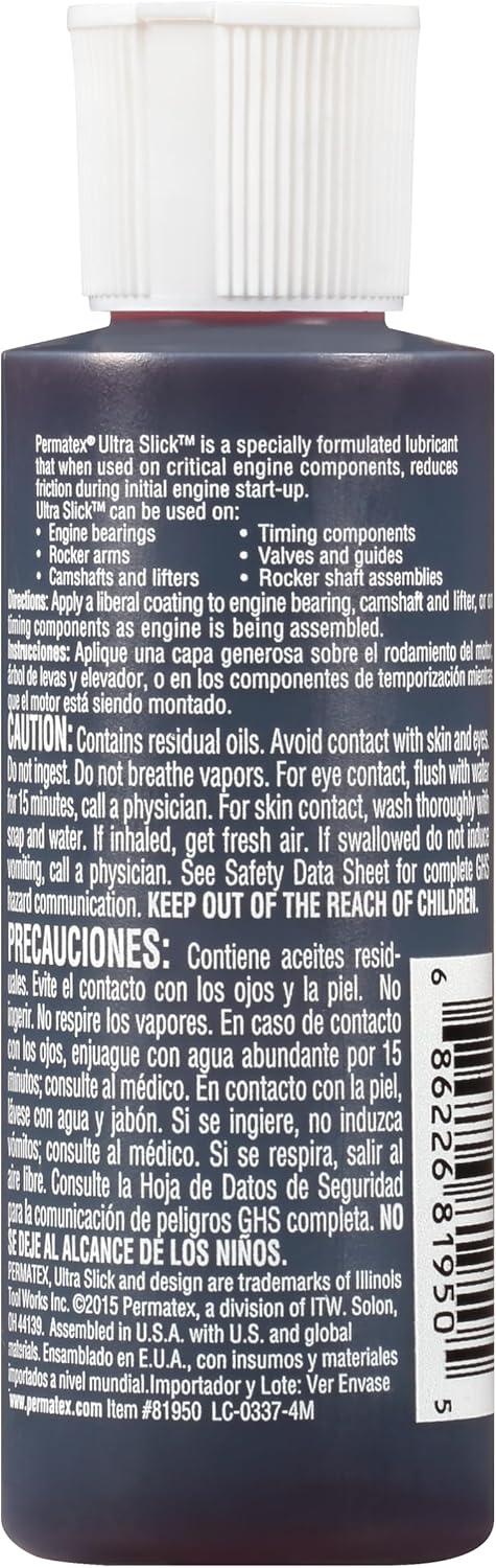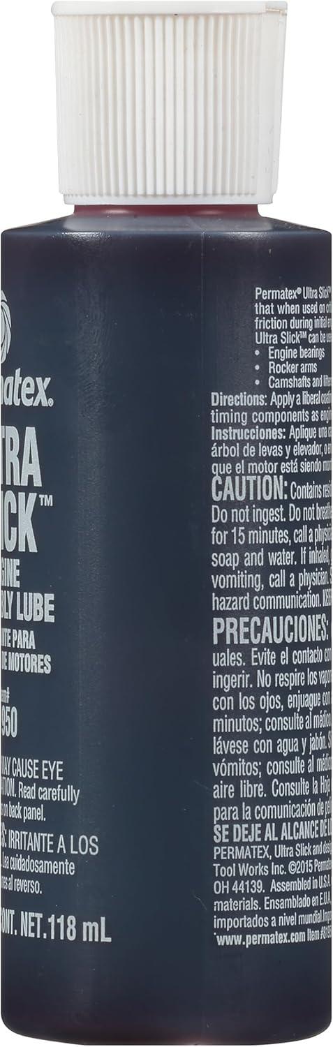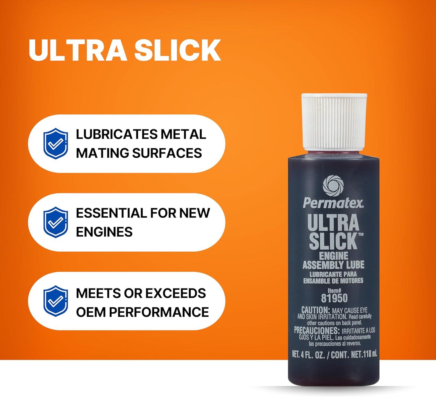Permatex Ultra Slick Engine Assemly Lube adheres to component surfaces to prevent scuffing and galling during initial start-up. Proper lubrication of metal mating surfaces is essential prior to starting a new or rebuilt engine. This high quality formulation meets or exceeds OEM performance specs for engine assembly lubricants. From special-mission, job-specific lubricants, protectants and dressings, to the rigors of heavy-duty needs, count on Permatex to bring you reliability and problem-solving solutions that extend the life of your equipment.