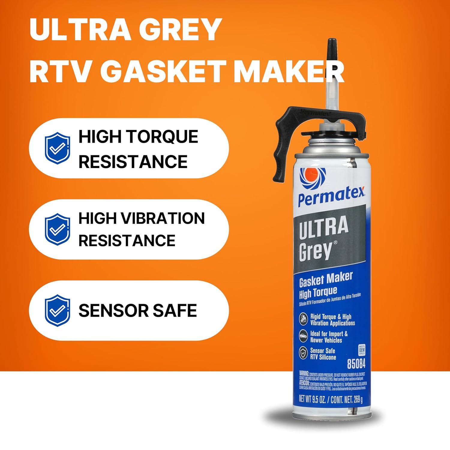 Permatex 82194 Ultra Grey Rigid High-Torque RTV Silicone Gasket Maker, Sensor Safe And Non-Corrosive, For High Torque And Vibration Resistant Applications, 3 oz(9.5 Fl. Oz.)