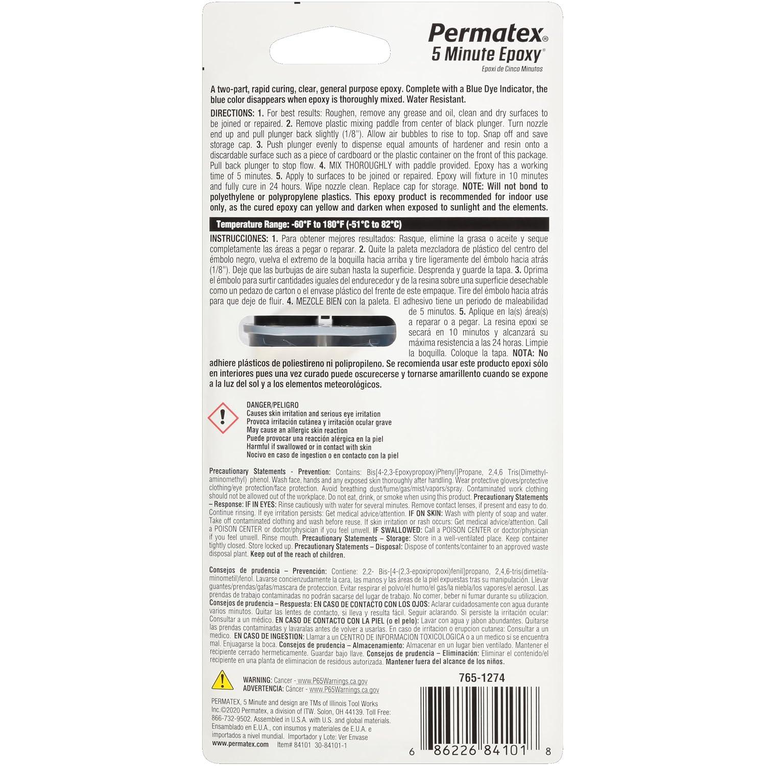 Permatex 5 Minute Gap Filling Epoxy is a versatile, easy-to-use, general purpose two-part adhesive and filler system. Sets in five minutes with no clamping needed. This clear epoxy fills gaps and will not shrink. Resistant to water and solvents with a permanent strength up to 3400 PSI. Temperature range -60°F to 180°F (-51°C to 82°C).