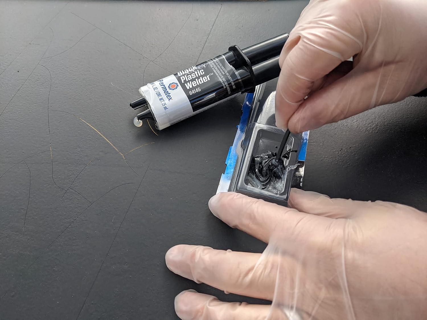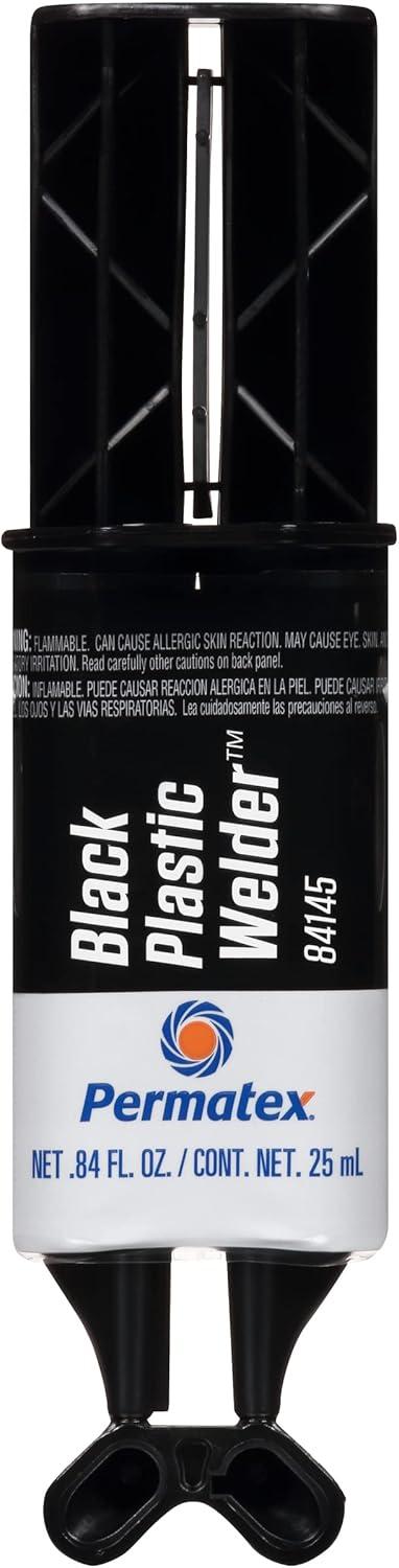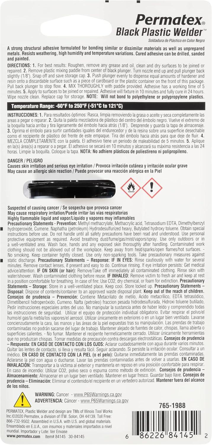 Permatex's Permapoxy Black Plastic Weld is a structural adhesive designed for general purpose bonding of a wide variety of materials. Black Plastic Weld forms a tough, durable bond to most plastics, composites, ceramics, and wood in any combination. It is a fast-curing product with gelling of mixed adhesive in 5 to 6 minutes and fixturing in 9 to 10 minutes. Bonds hard and soft plastics to specified surfaces, and requires no primers. Sets in five minutes at room temperature, with a temperature range of -60 degrees Fahrenheit to 250 degrees Fahrenheit (-51C to 121C). Permanent strength up to 3500 PSI, and gap filling to 0.125 inches. This epoxy is water resistant, with good chemical resistance. Suggested Applications: Bonds rigid materials including ABS, acrylic, fiberglass, FRP, glass, PVC, SMC, steel, styrene, vinyl, and wood. NOTE: Permatex Black Plastic Weld will not bond polyethylene and polypropylene plastics.